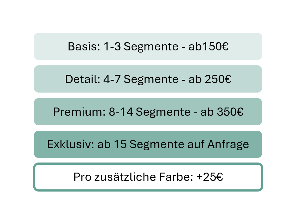 Der Preis richtet sich nach der Anzahl der Einzelteile, aus denen Ihr GebĂ€udemodell besteht (siehe PreisĂŒbersicht in der Galerie). Eine höhere Zahl an Bauteilen bedeutet einen gröĂeren Modellierungs- und Fertigungsaufwand. DarĂŒber hinaus beeinflusst auch die Anzahl der verwendeten Farben den Gesamtpreis, da jeder Farbwechsel zusĂ€tzlichen Produktionsaufwand erfordert.